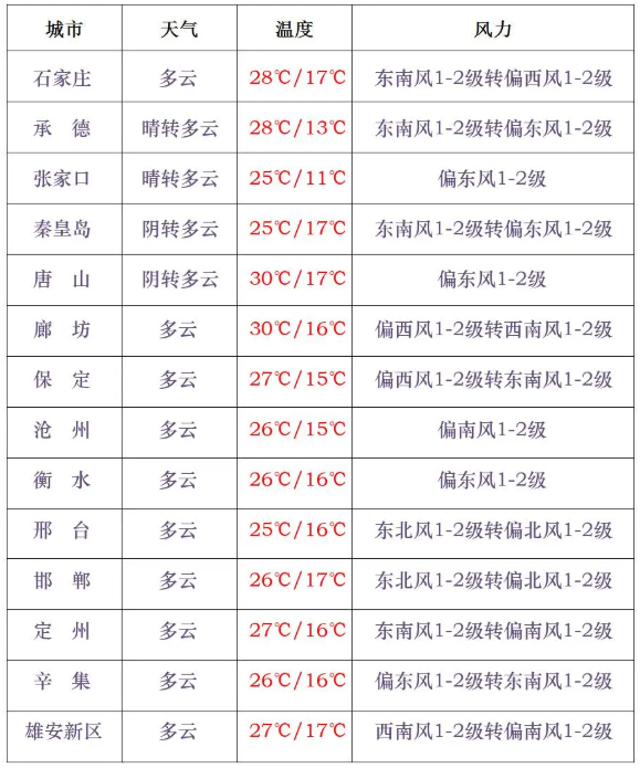今天白天,唐山、秦皇岛、沧州东部多云间阴有零星小雨,其他地区多云转晴。