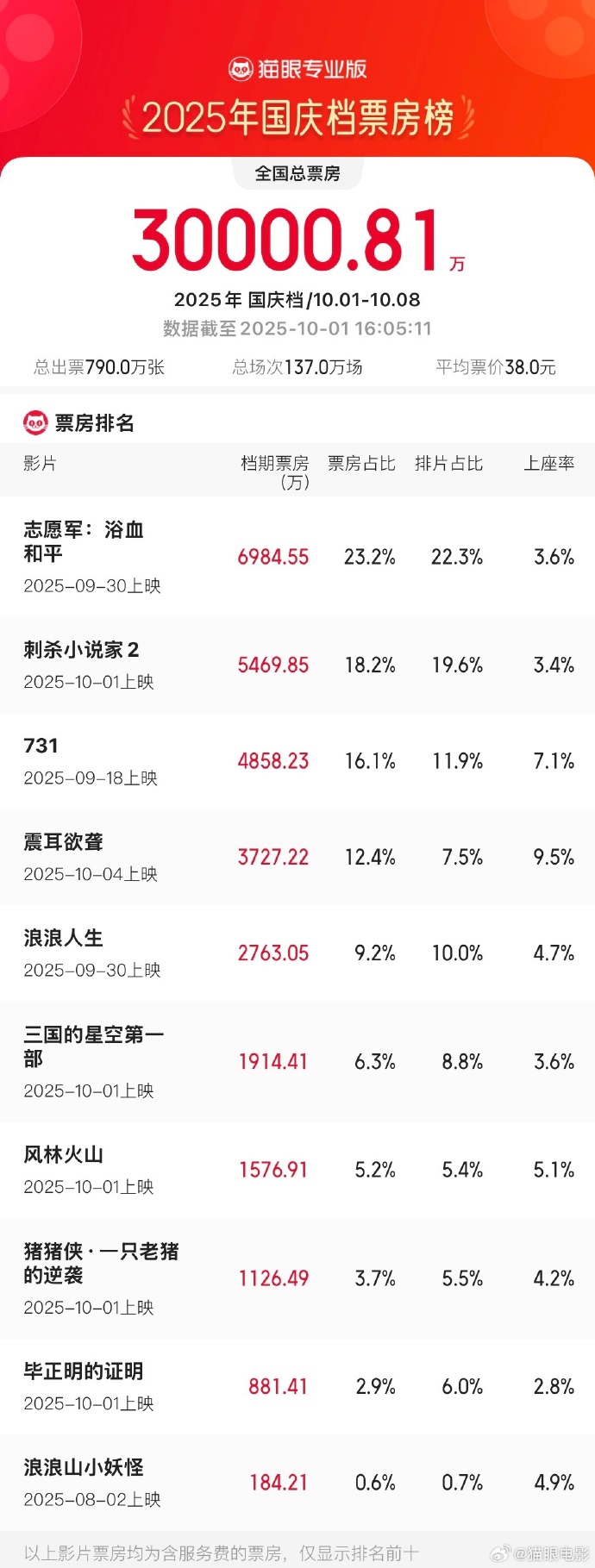 据猫眼专业版数据,截至10月1日16时05分,2025年国庆档档期票房破3亿。《志愿军:浴血和平》《刺杀小说家2》《731》分列前三位。