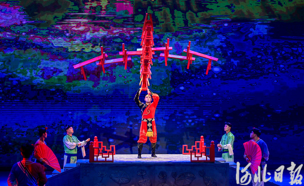 9月28日,“为人民绽放——国家艺术基金优秀杂技节目展演”在吴桥江湖大剧院举办,安徽省杂技团演员正在表演《顶板凳》。河北日报记者 李东宇摄
