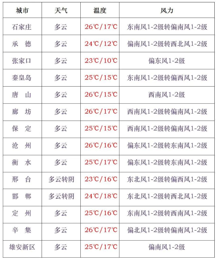 今天白天,石家庄、沧州以南地区多云,其他地区多云间晴。天气舒爽,适宜出游。