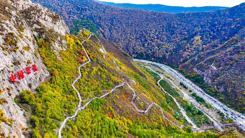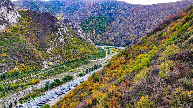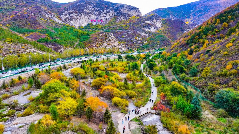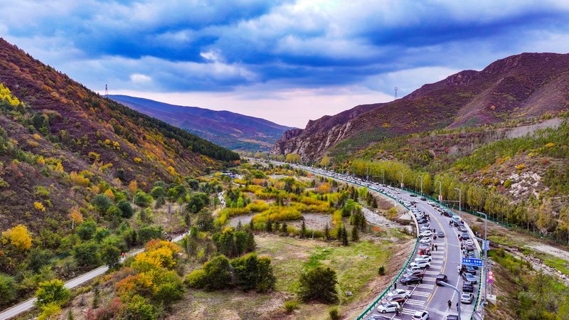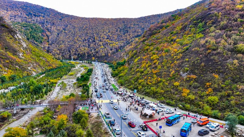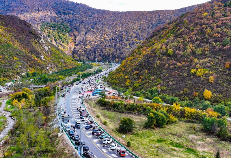 10月4日,游客在张家口市崇礼区梧桐大道欣赏秋景。