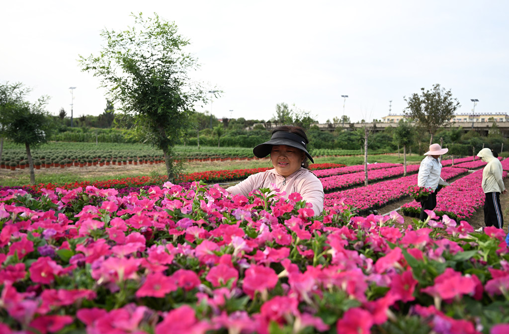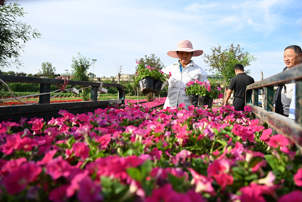 9月20日,在邢台市南和区鑫茂花卉苗木场,花农将鲜花搬运装车,供应市场。