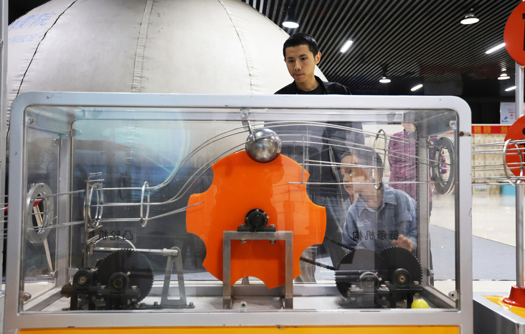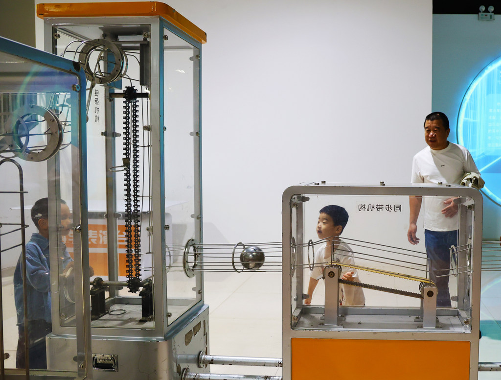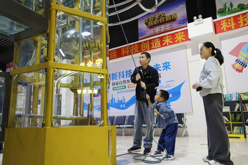 10月5日,市民陪孩子在平乡县科技馆体验机械滚球装置。