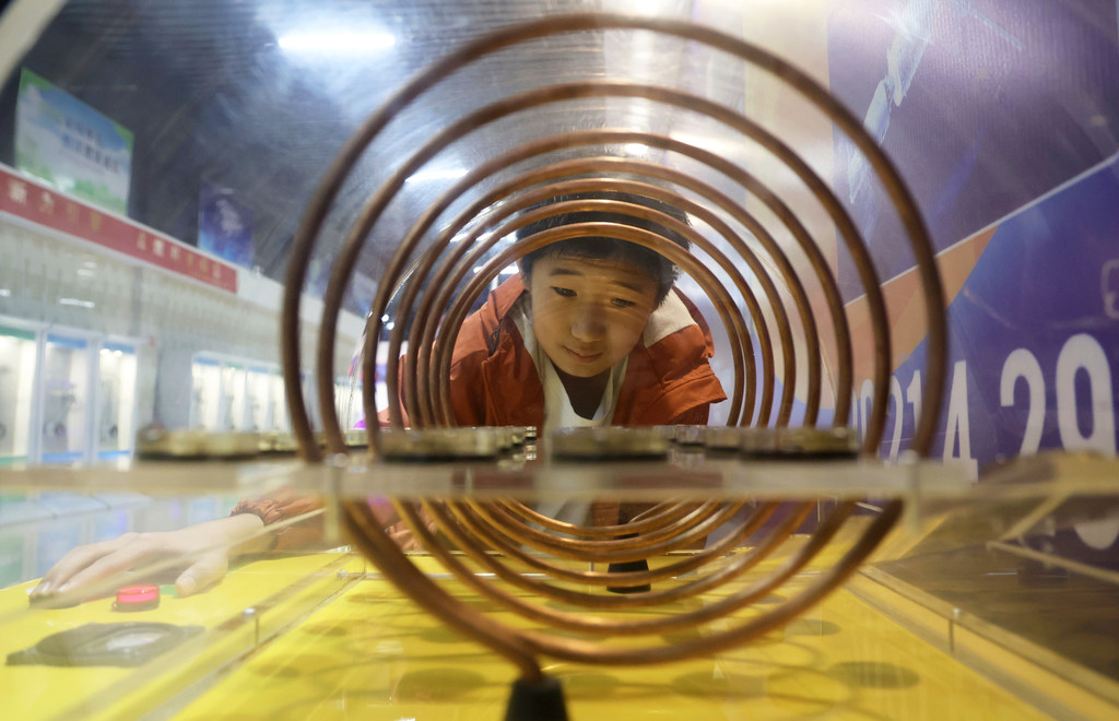 10月5日,小朋友在平乡县科技馆体验通电线圈与磁力线装置。