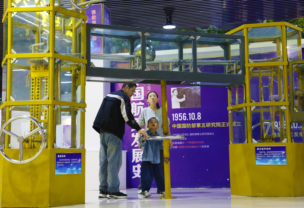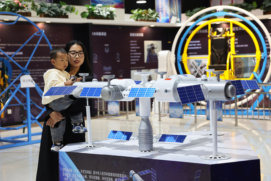 10月5日,市民陪孩子在平乡县科技馆参观中国空间站模型。