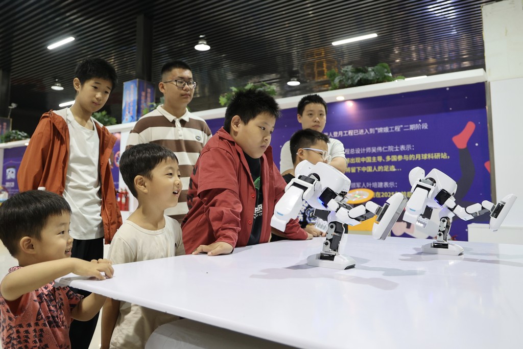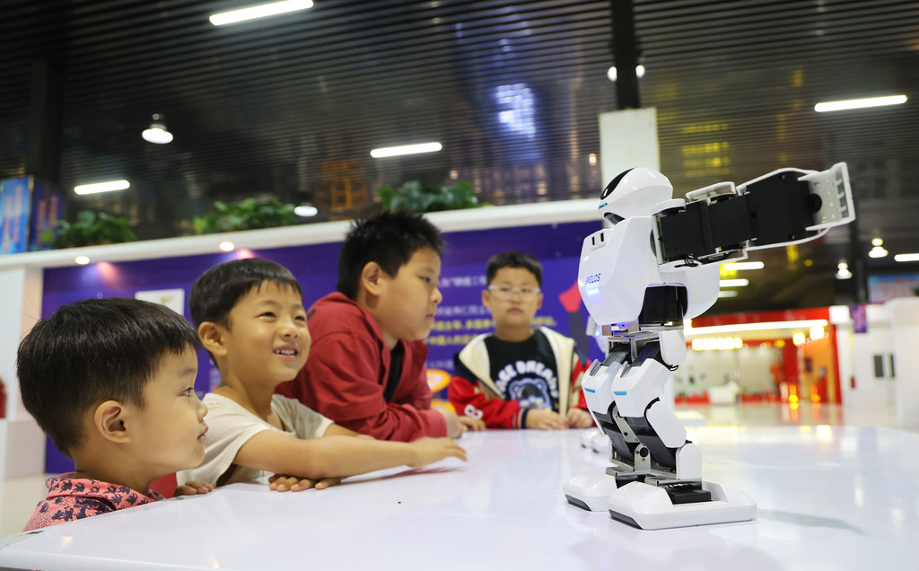 10月5日,孩子们在平乡县科技馆里观看机器人表演。