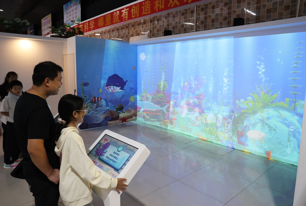 10月5日,市民陪孩子在平乡县科技馆海洋绘画馆沉浸式体验绘画活动。
