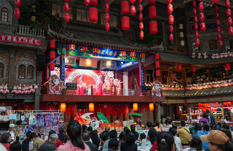 10月5日,游客在保定宴饮食博物馆观看演出。