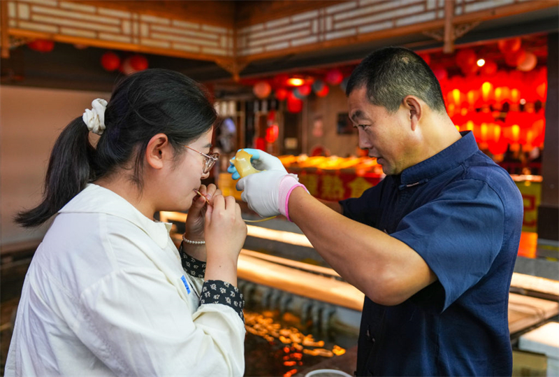 10月5日,游客在保定宴饮食博物馆体验吹糖人技艺。
