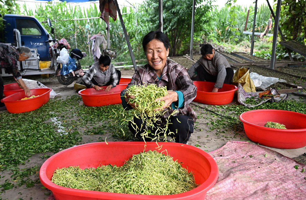 9月21日,邢台市南和区史召乡李牌村村民在分拣采摘的金银花。