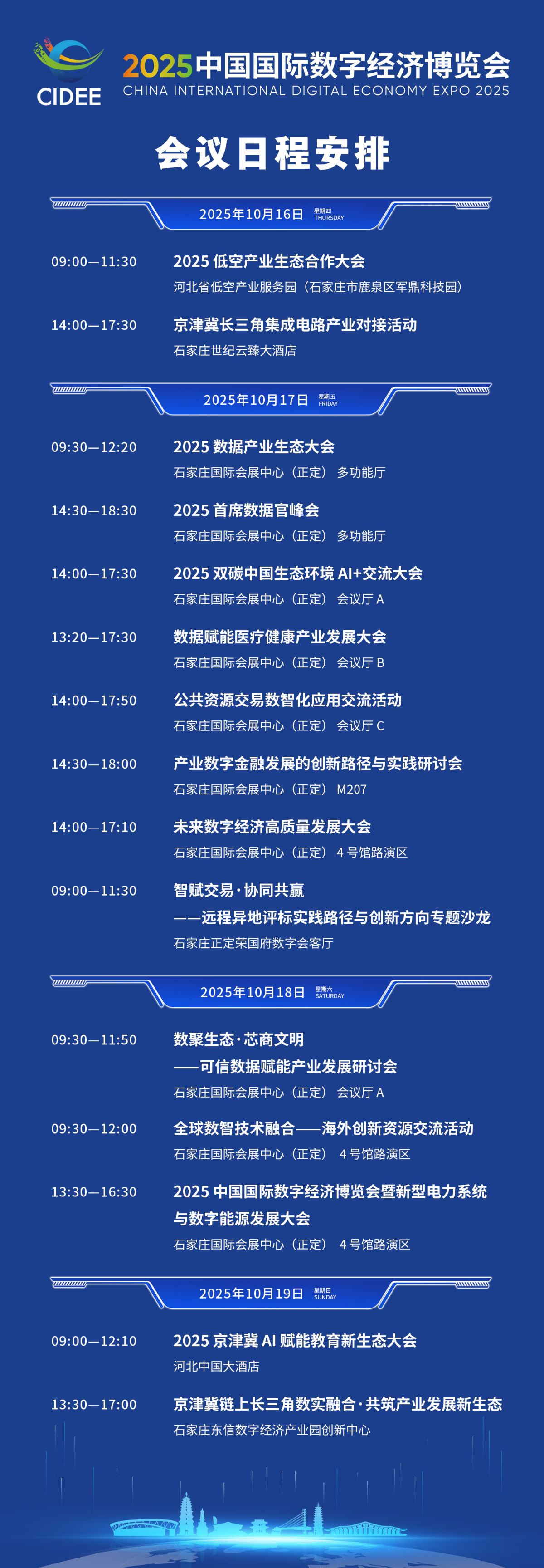 2025中国国际数字经济博览会将于10月17日至19日在石家庄(正定)国际会展中心举办。为期三天的博览会都有哪些日程安排呢?点击图片看看吧。