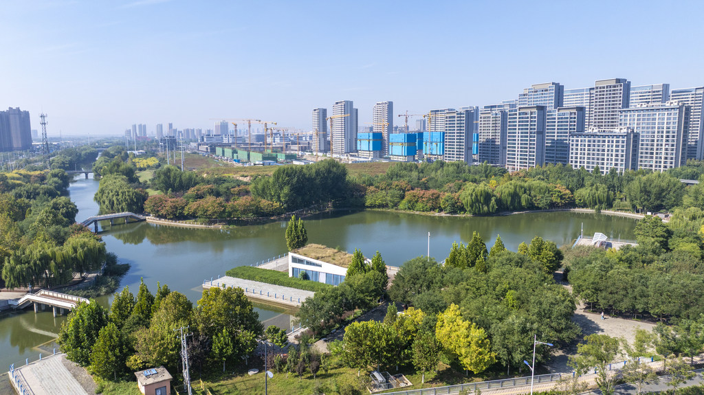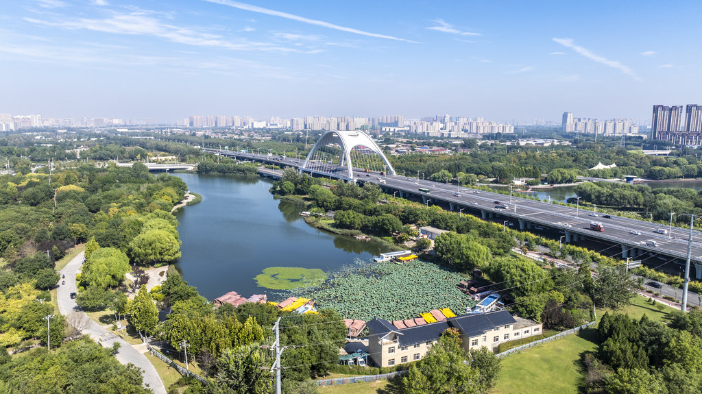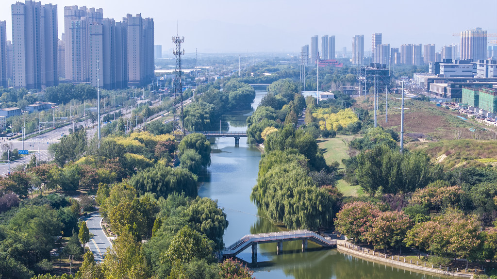 10月15日,无人机拍摄的石家庄市东南环城水系泊水公园。