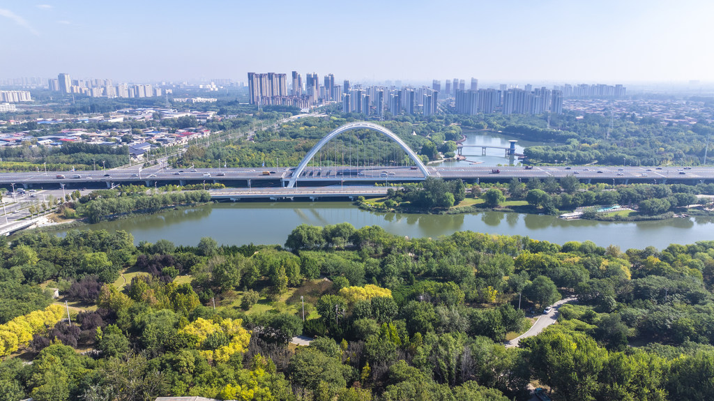 10月15日,无人机拍摄的石家庄市复兴大街与东南环城水系泊水公园。
