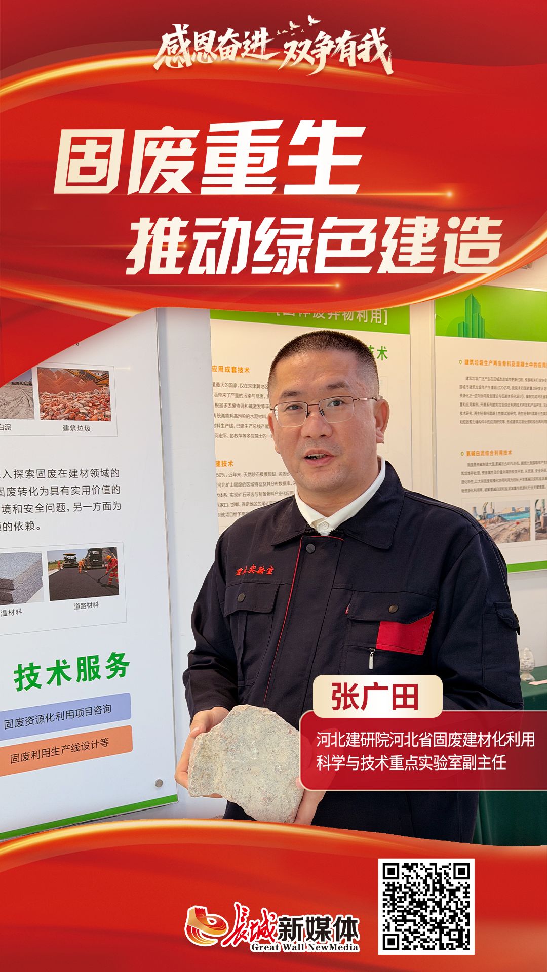 多年来,张广田带领团队从实验室到工厂反复打磨技术,让尾矿变身砂石,让废渣替代水泥,将废料转化为优质建材,助力打造绿色低碳示范工程。