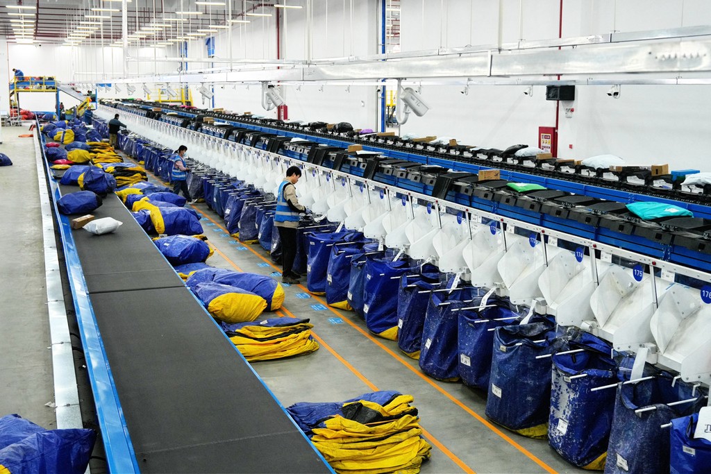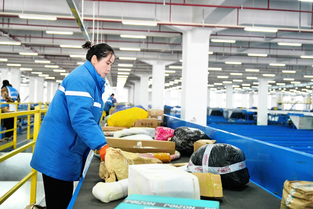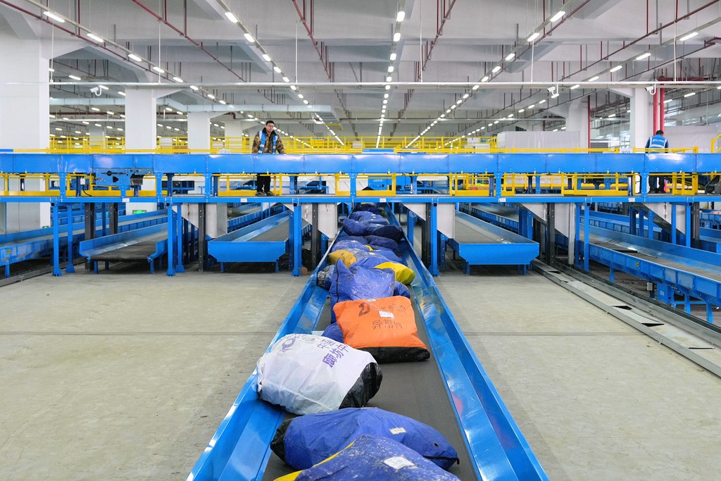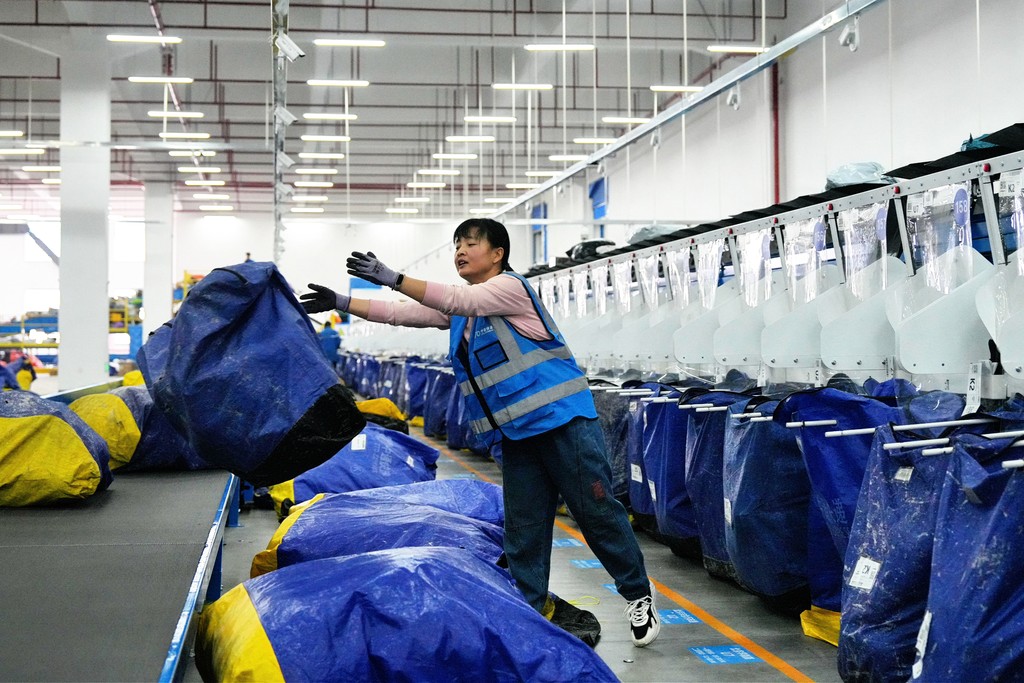 10月23日,工作人员在廊坊市广阳经济开发区的中通快递北方总部分拣快递。