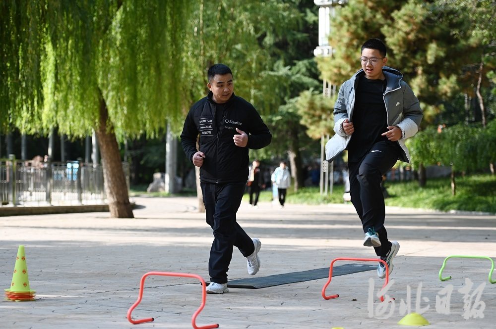 10月26日,孙文(左)在石家庄市裕华区希望绿洲公园指导学员训练。河北日报记者 王伟宏 摄
