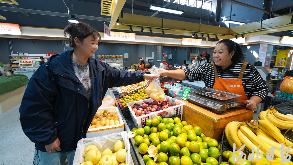 10月13日,在雄安大河便民市场,顾客(左)正在购买水果。河北日报见习记者李畅摄