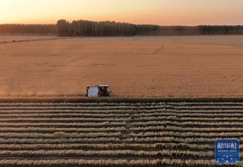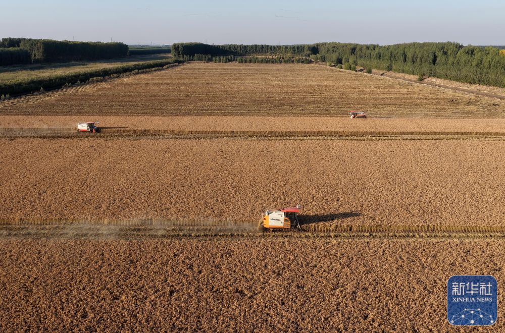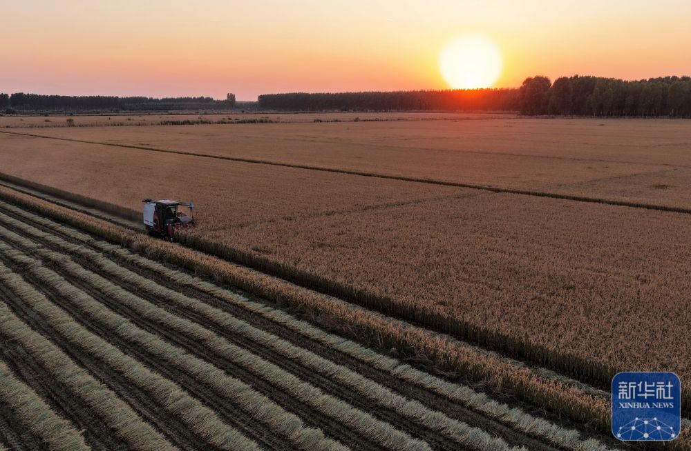 ↑ 10月27日,河北省唐山市丰南区西葛镇的农民在田间收获水稻。