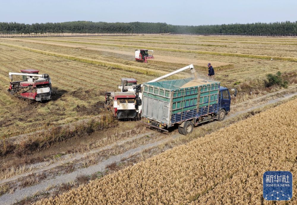 近日,河北省唐山市的水稻迎来收获季,当地农民抢抓晴好天气收获水稻。新华社记者 杨世尧 摄影报道