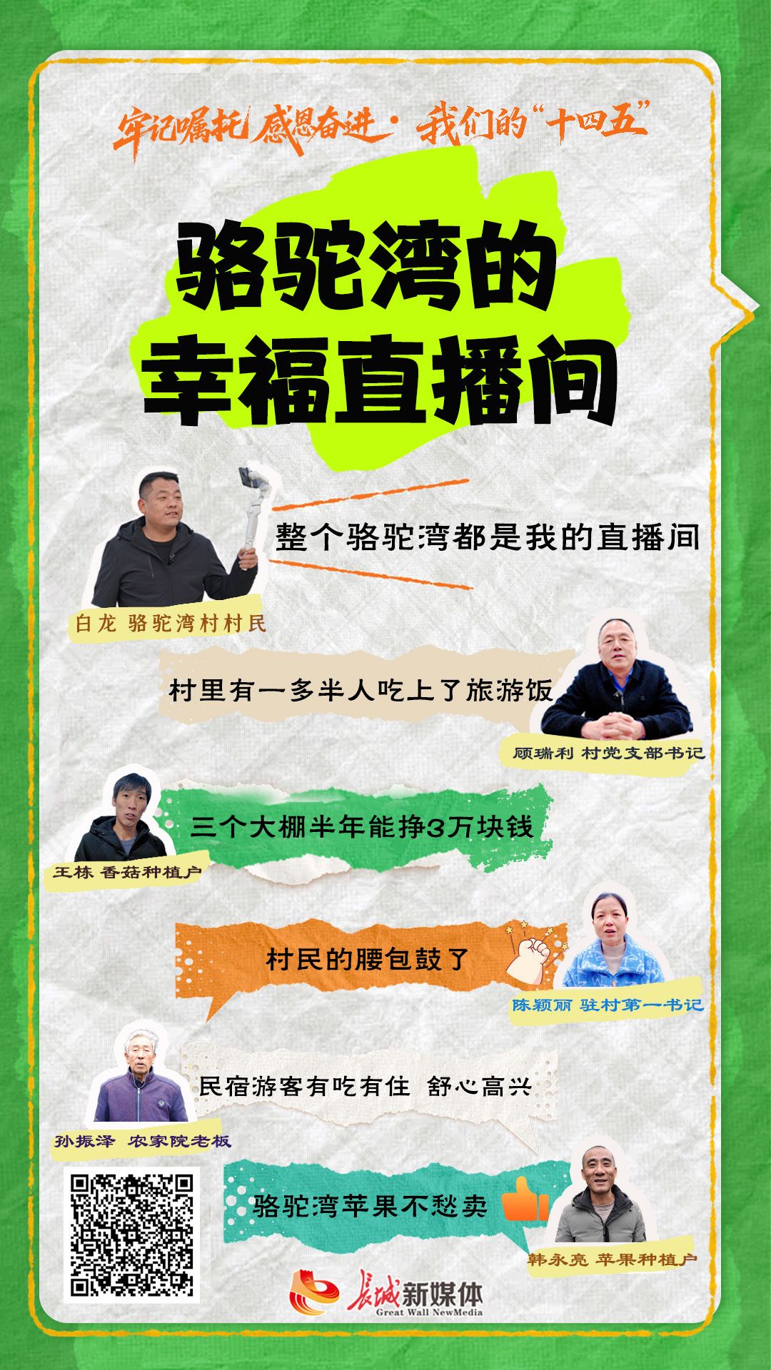 喜欢琢磨的白龙没闲着,“记者们三天两头来我们这里采访,我就想能不能主动宣传宣传自己。”今年7月,酝酿了很久的他终于开了直播,“咱不用屋,整个骆驼湾就是我的直播间,边走边播,每天带大家看不一样的风景,感受骆驼湾的发展变化。”