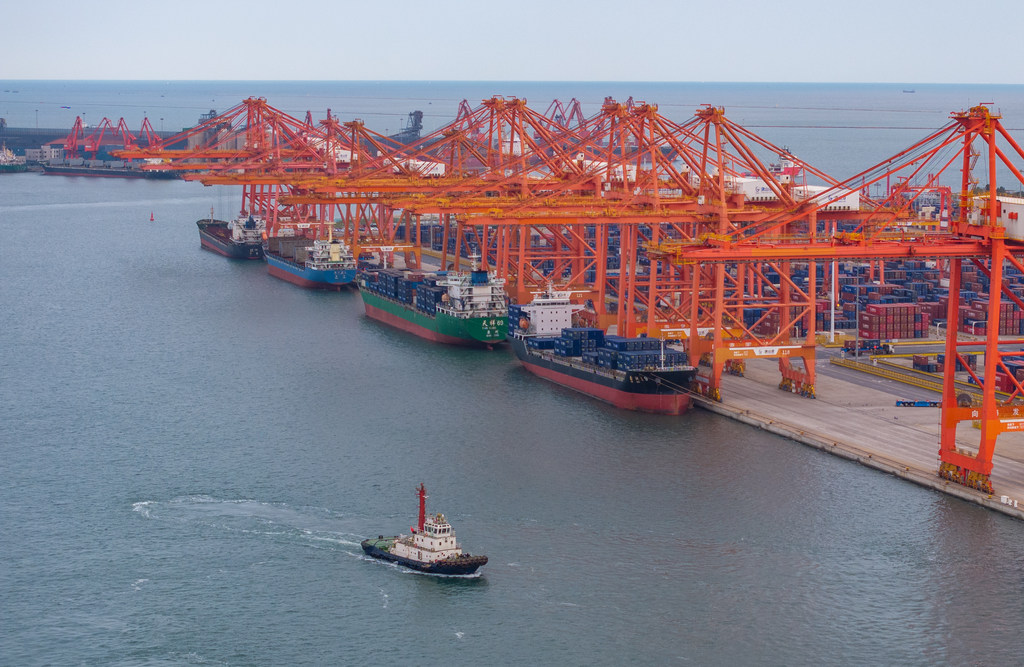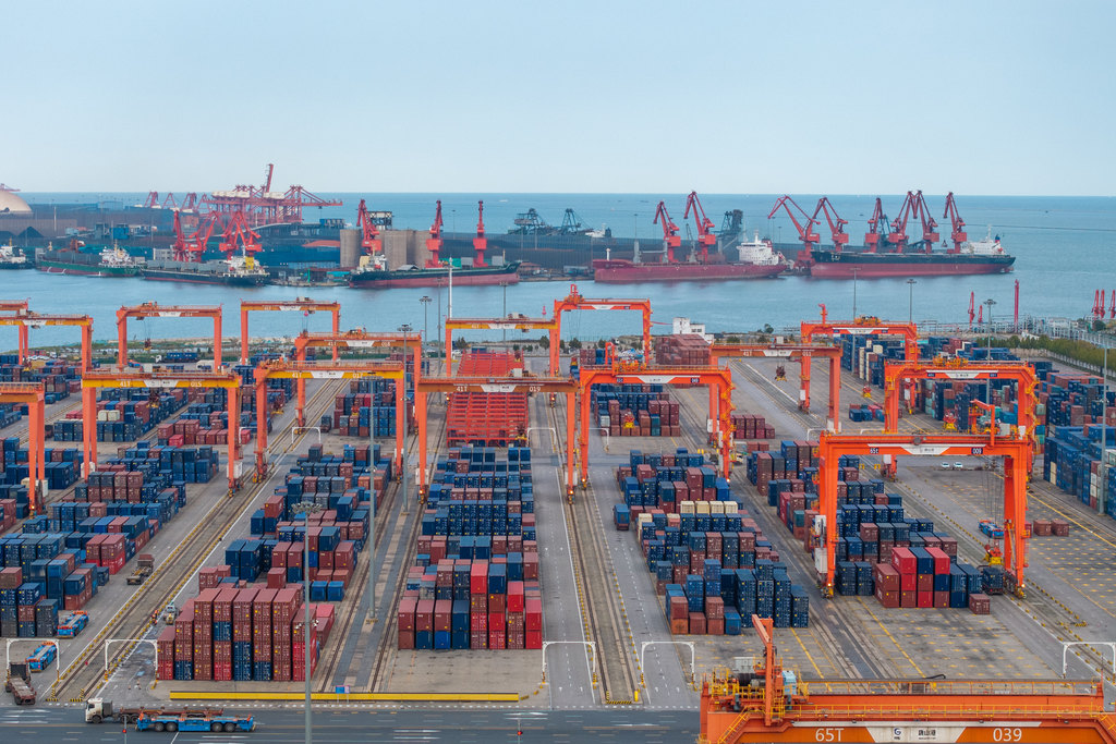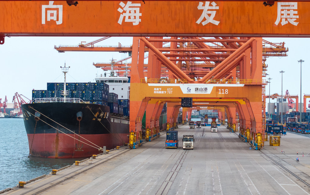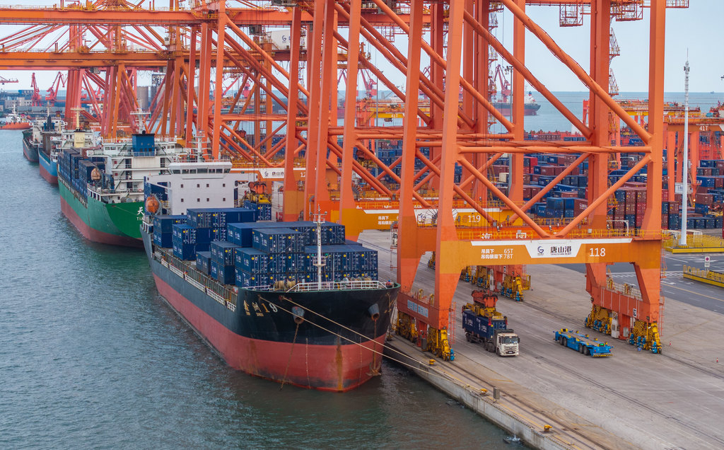 10月23日,河北港口集团京唐港区,货轮正在进行集装箱装卸作业。