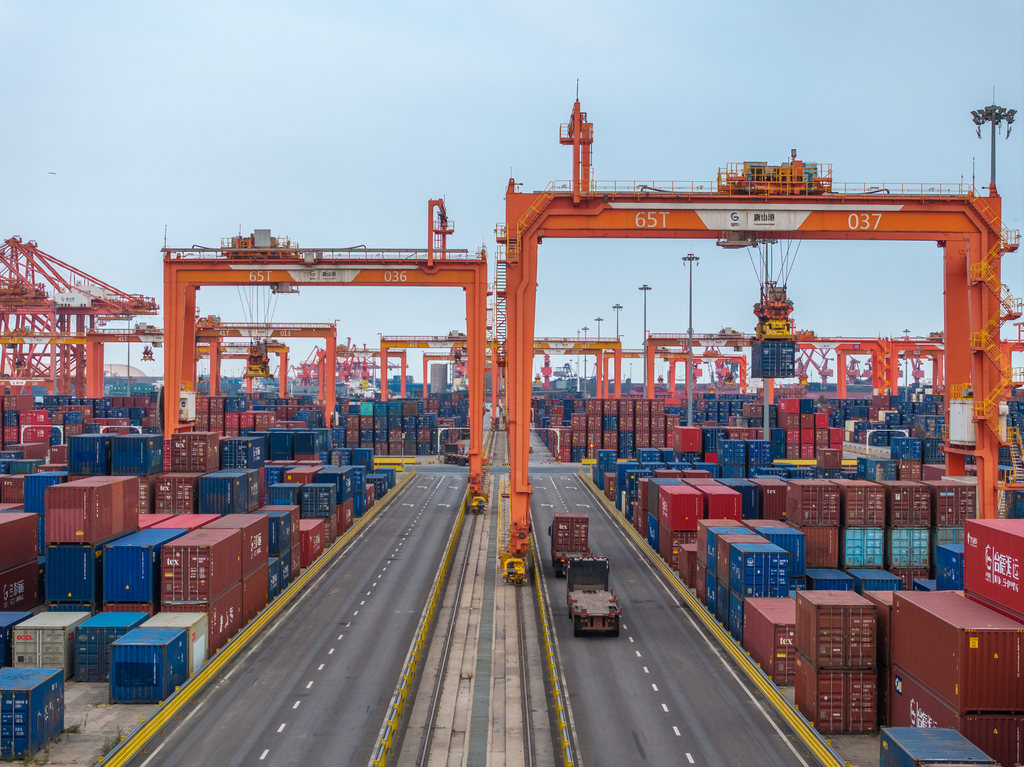 10月23日,河北港口集团京唐港区集装箱码头堆场,货车正在进行集装箱装卸作业。