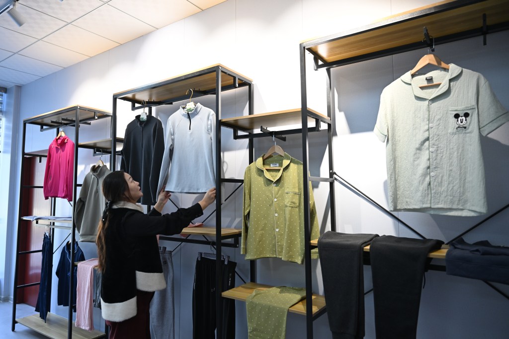 10月27日,在邢台市南和区和阳镇高博美服装有限公司展厅,工人在摆放展品。