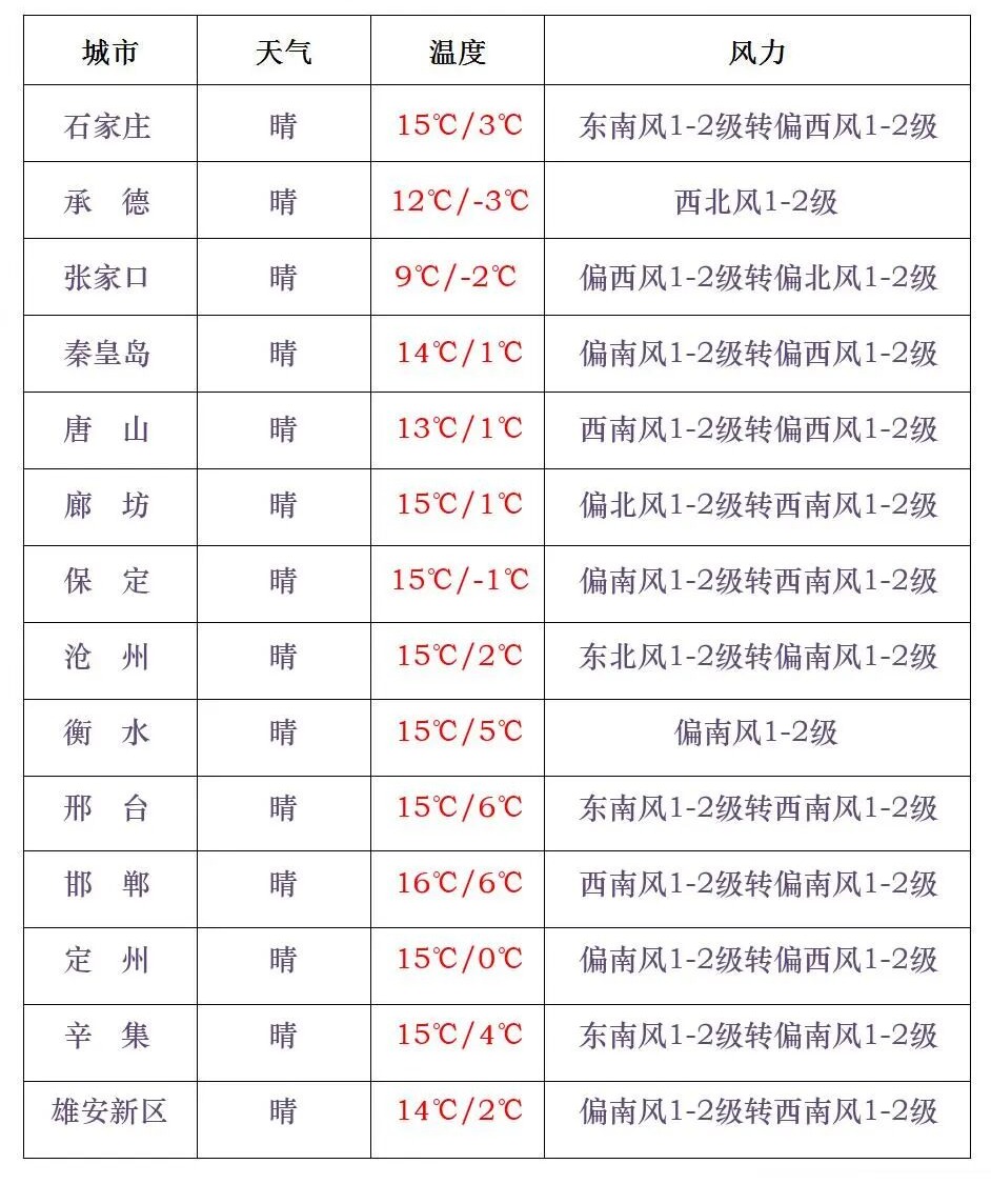 今天早晨,张家口、承德北部、保定西北部最低气温下降4~6℃。白天,全省晴间多云。