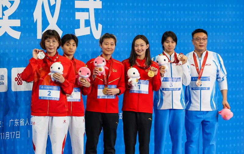 11月12日,河北运动员李冰洁(右三)与教练员崔卜丹(右四)站在领奖台上。