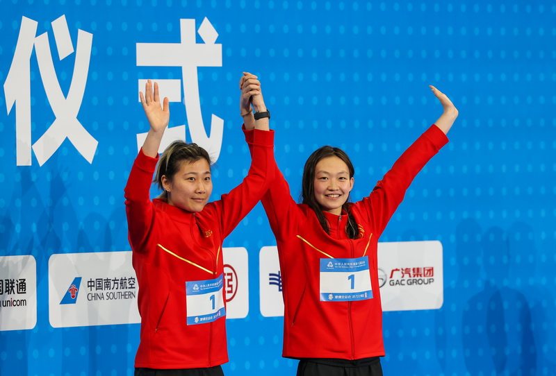 11月12日,河北运动员李冰洁(右)与教练员崔卜丹站在领奖台上。