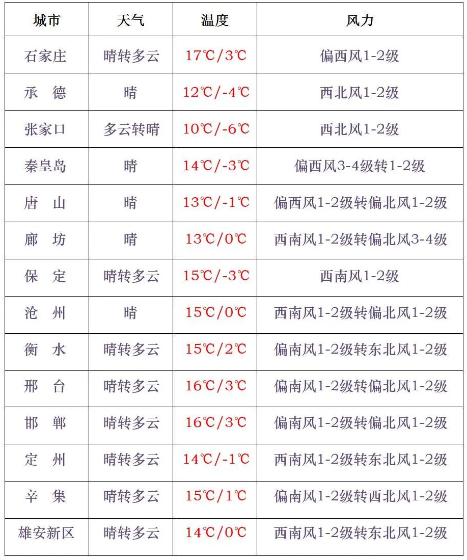 今天白天,全省晴间多云。张家口、承德北部、保定西北部有西北风4到6级,阵风7到8级,局地可达9级以上。