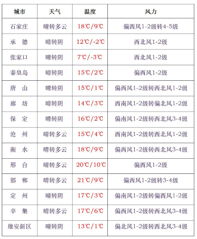 今天白天,张家口北部、承德北部晴转多云,其他地区晴间多云。今天夜间到24日,保定、廊坊及以北地区多云转阴,其中张家口北部、承德东部、唐山南部、秦皇岛有小雪或雨夹雪,其他地区多云。