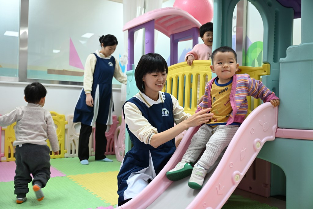 11月24日,邢台市南和区人民医院早托一体中心,保育师在陪孩子玩滑梯。