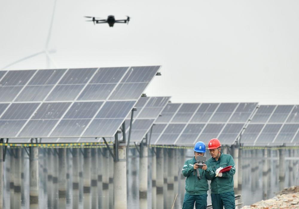 ↑12月10日,国网沧州供电公司的工人在辖区渤海新区黄骅市一处“渔光互补”光伏发电场使用无人机巡检。