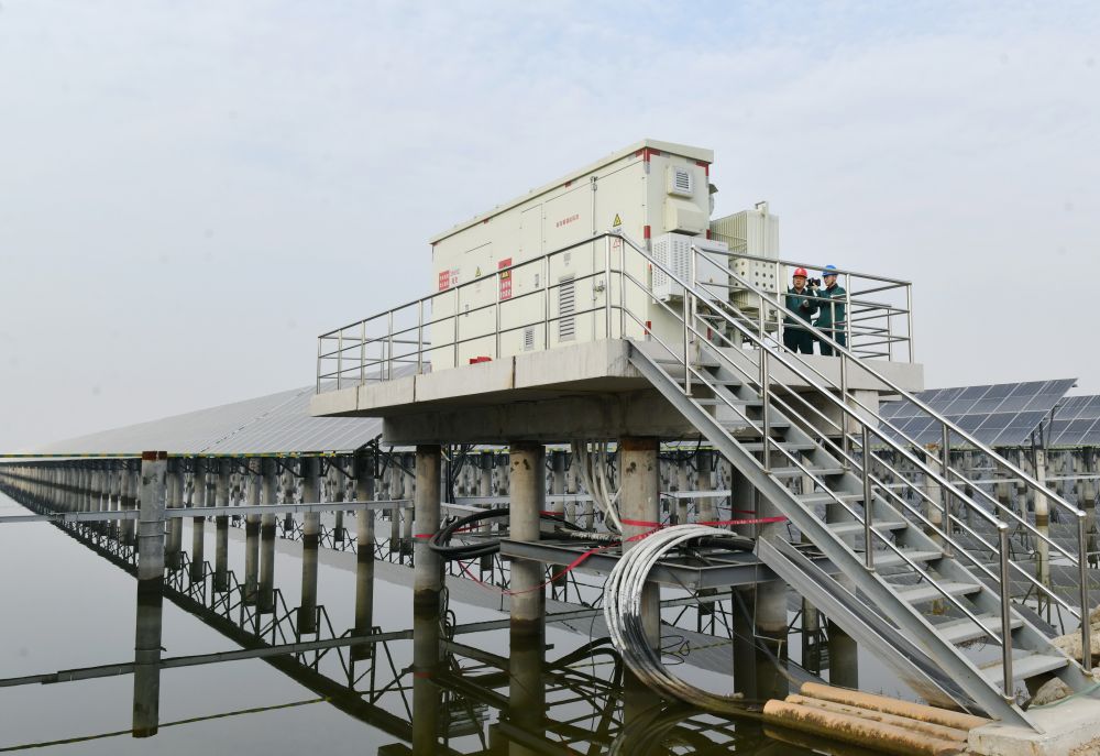 ↑12月10日,国网沧州供电公司的工人在辖区渤海新区黄骅市一处“渔光互补”光伏发电场巡检。