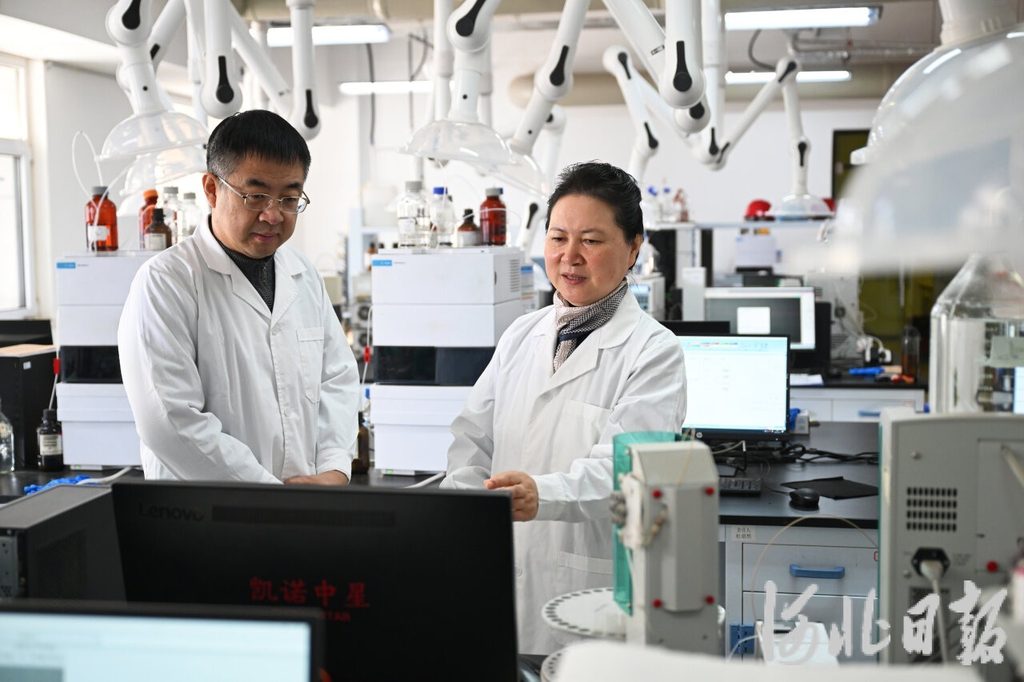 12月14日,孙凤霞(右)和爱人宋志永在实验室分析光刻胶材料数据。河北日报记者 赵永辉摄