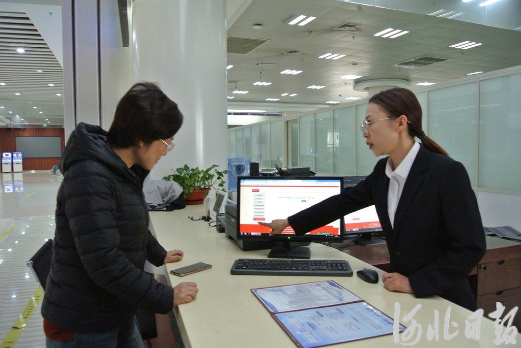 在沧州市政务服务中心,沧州市行政审批局工作人员(右)向办事群众介绍如何便捷获取专项信用报告。(河北日报资料片)河北日报记者 王雅楠 摄