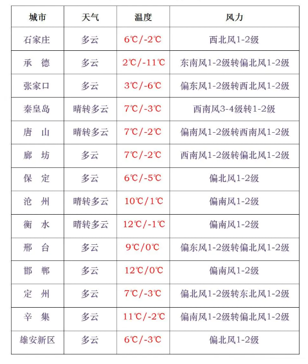 今天白天,全省晴转多云。今天夜间到明天,坝上地区多云转阴有零星小雪,其他地区多云。今明两天早晨,平原中东部地区仍有雾。