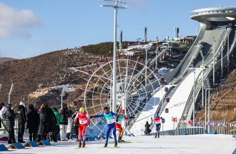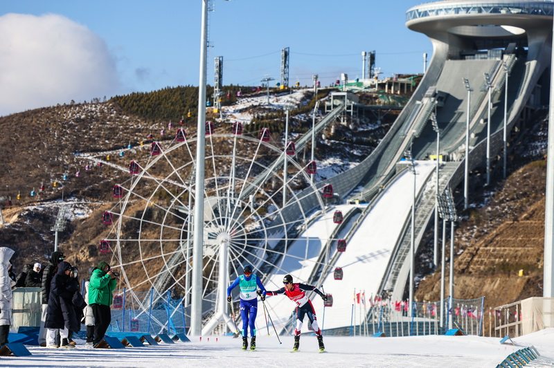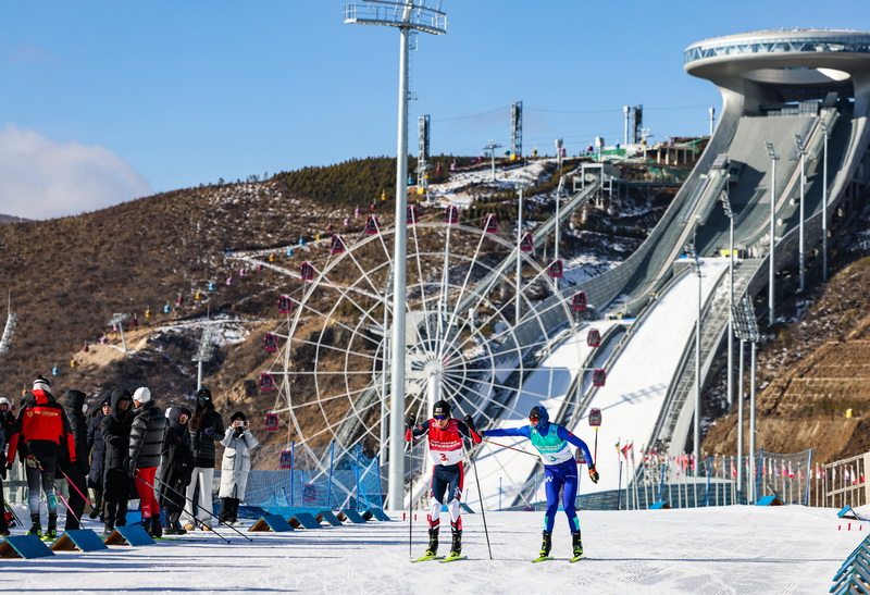 12月19日,河北选手刘一飞(右二)与王誉达(右一)在越野滑雪接力比赛中。