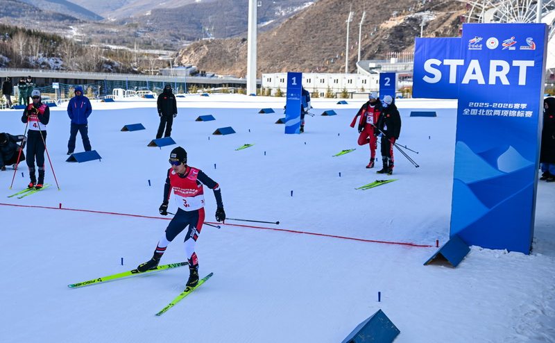 12月19日,河北选手刘一飞(前)在越野滑雪接力比赛中出发。