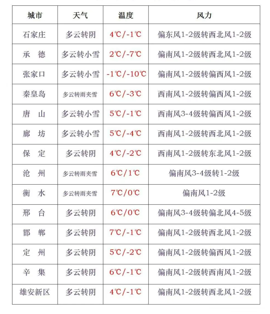今天白天,邢台、邯郸多云转阴,其他地区多云。今天夜间到明天,全省阴转多云,其中张家口、承德、唐山北部、秦皇岛北部、保定西部和北部、雄安新区、廊坊北部、石家庄西部有小雪或零星小雪,唐山南部、秦皇岛南部有雨夹雪转小雪,廊坊南部、沧州、衡水、邢台东部、邯郸东部有雨夹雪或小雨。