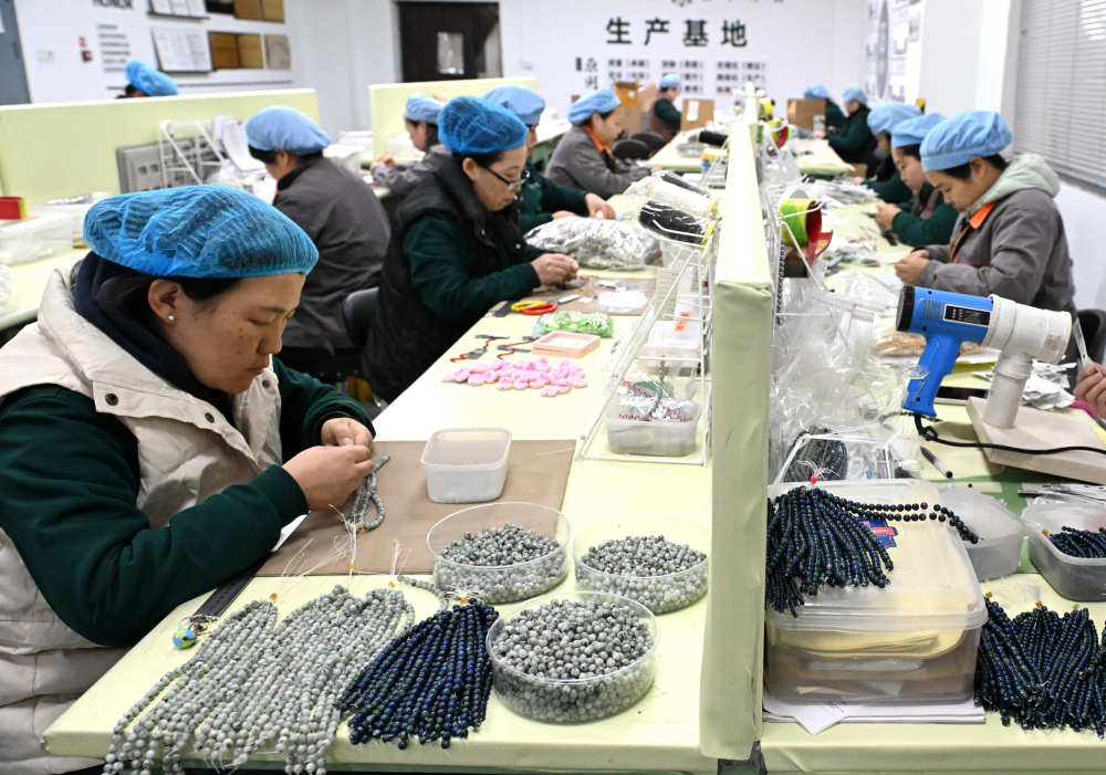 12月22日,在河北省石家庄市一家珠宝产品创意企业,工作人员在制作项链。