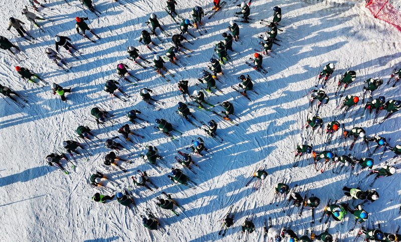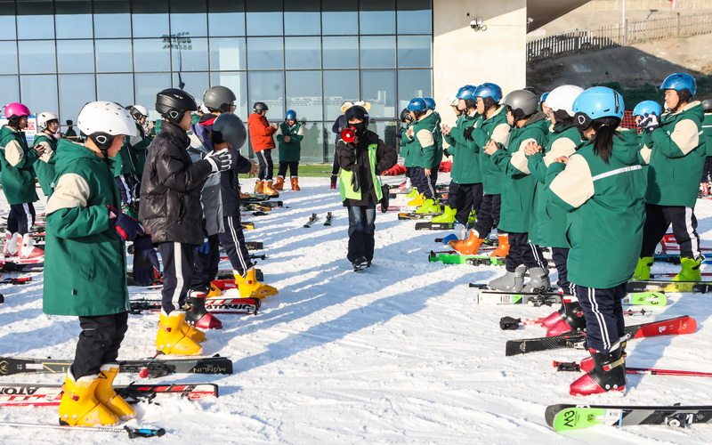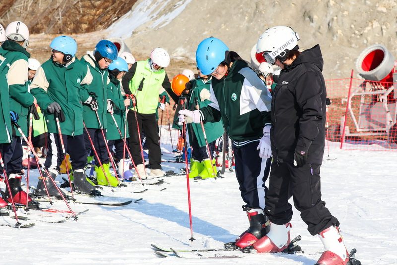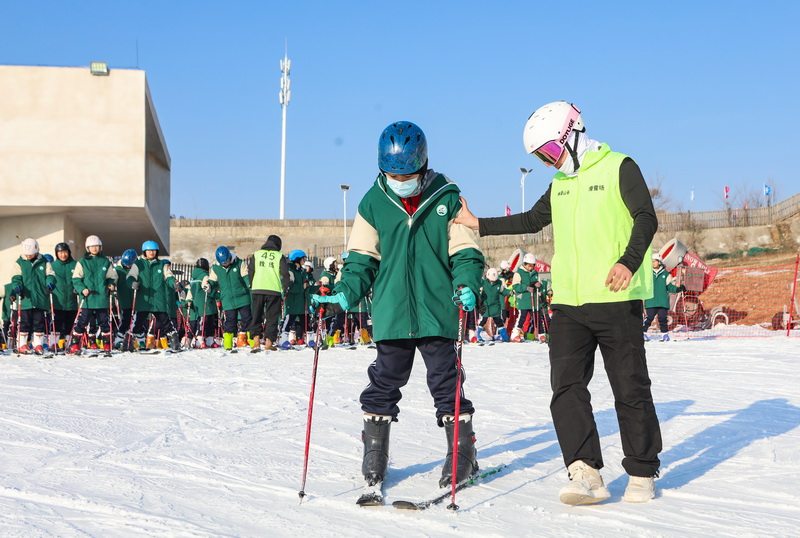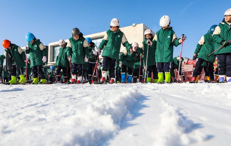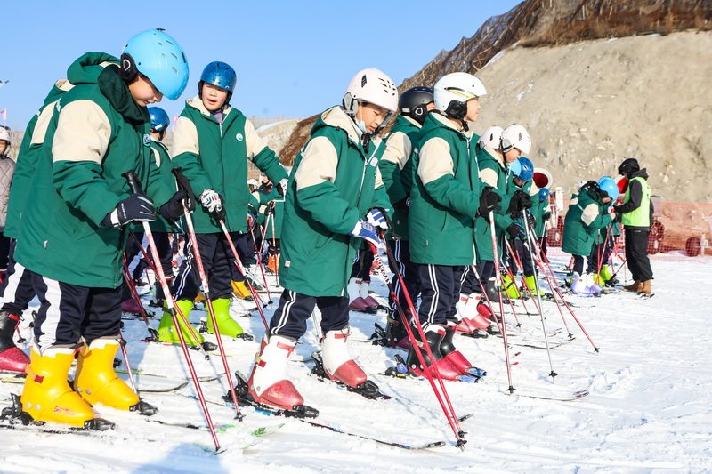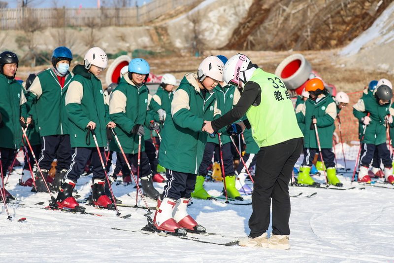 12月24日,张家口市二十中学生在万全区林语山谷滑雪场体验滑雪。