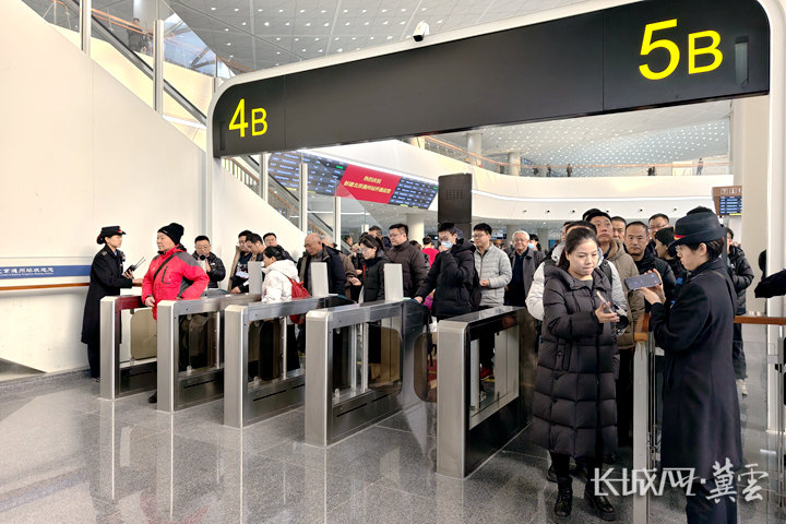 在北京通州站,乘客排队安检。