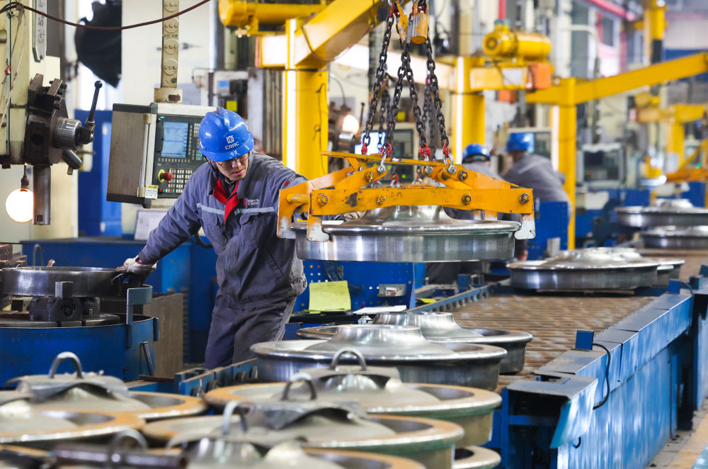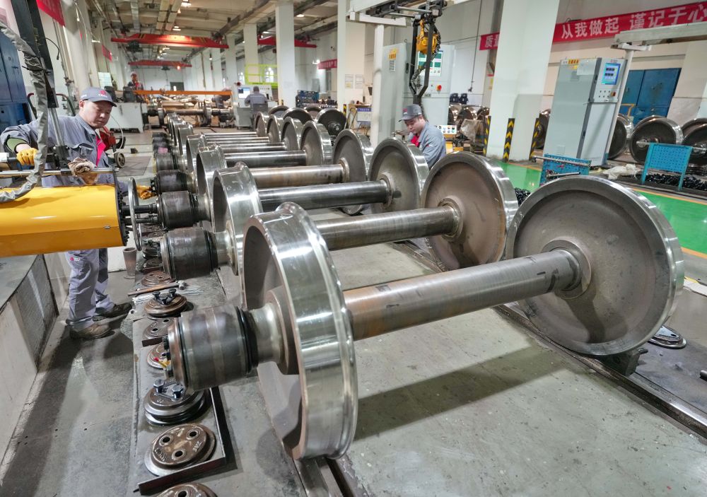 ↑1月8日,工人在中车石家庄车辆有限公司生产火车轮对。新华社发(梁子栋 摄)