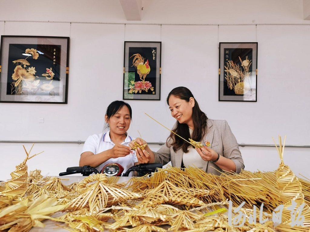 在邯郸市大名县禹善非物质文化遗产残疾人传承教育中心,负责人谷穗(右)指导学员制作草编装饰品。(河北日报资料片)河北日报记者卢旭东摄