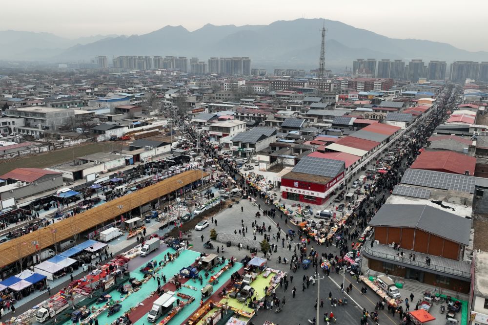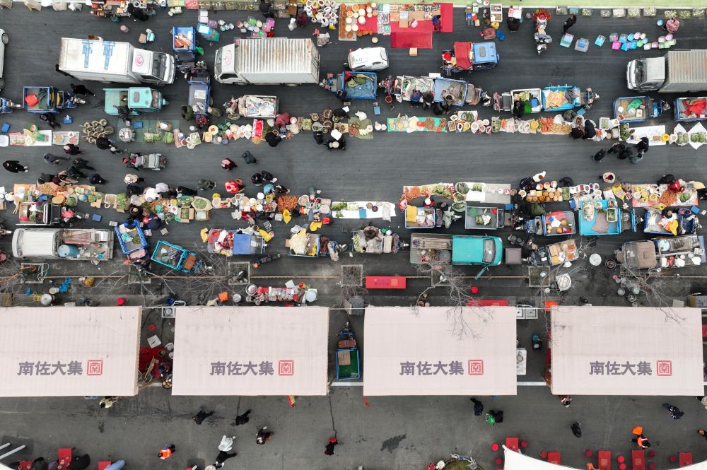 ↑1月14日,人们在河北省元氏县南佐大集上选购商品(无人机照片)。新华社发(梁子栋摄)