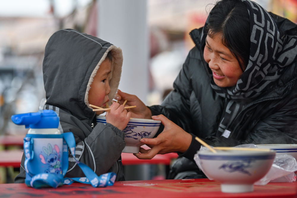 ↑1月14日,在河北省元氏县南佐大集上,一位女士让孩子品尝地方小吃。新华社记者 杨世尧 摄