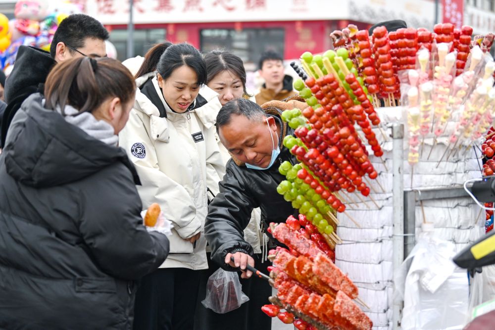 ↑1月14日,游客在河北省元氏县南佐大集购买糖葫芦。新华社发(张晓峰摄)