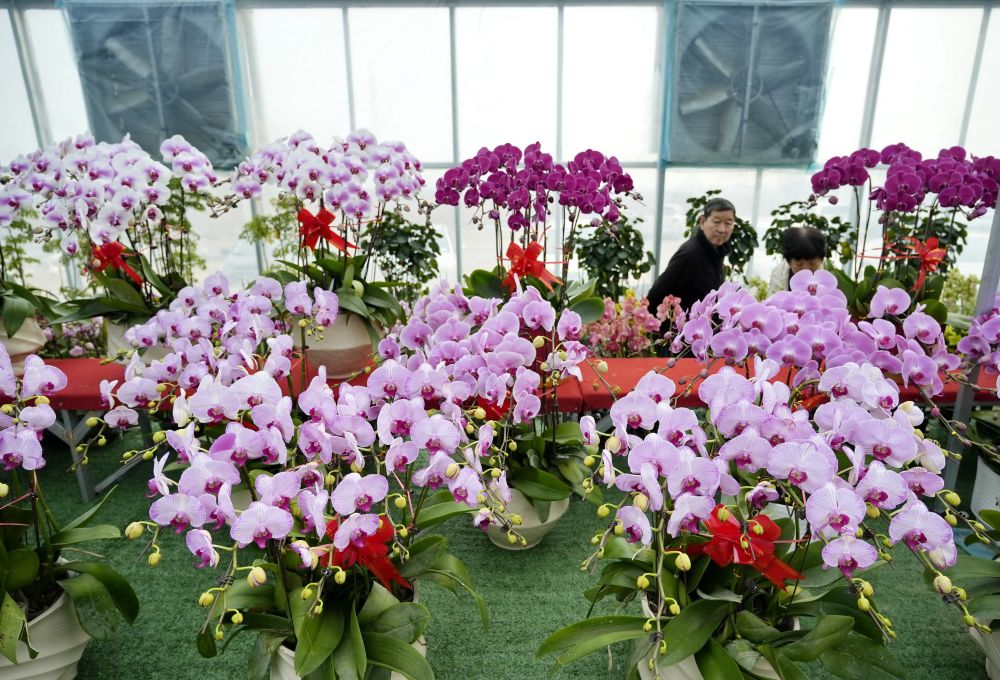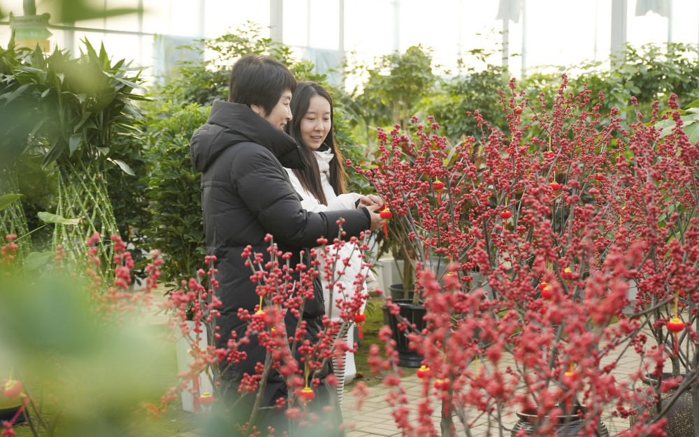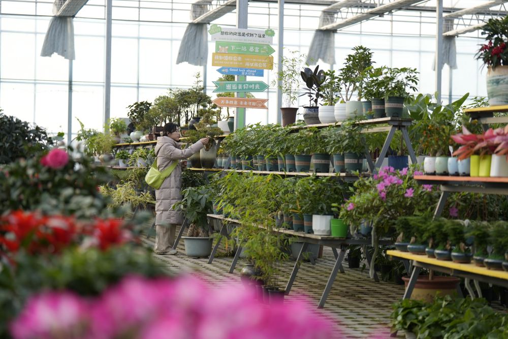 ↑1月15日,市民在河北省滦州市一家花卉生产基地温室内挑选绿植。